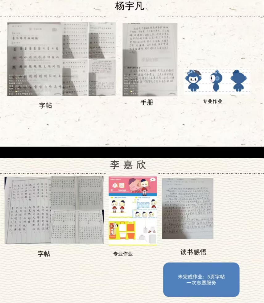 首先,张晶老师向同学们说明了社会实践学期的重要性以及注意事项,提醒同学们认真完成作业和假期安全,然后,由视觉专升本241班叶凯、视觉231李馨悦、视觉221李嘉欣汇报讲解本小组的本周完成情况,大家第五周完成了专业作业,志愿服务,周字贴等,专业下达的作业完成较好。本周学生们都进行了字帖描摹。字帖对大学生益处颇多。练字能修身养性,在一笔一划中沉淀浮躁的心;还可提升书写颜值,让作业、考试卷面更整洁,给老师留下好印象;同时,临摹字帖也是对传统文化的体悟,丰富精神内涵。