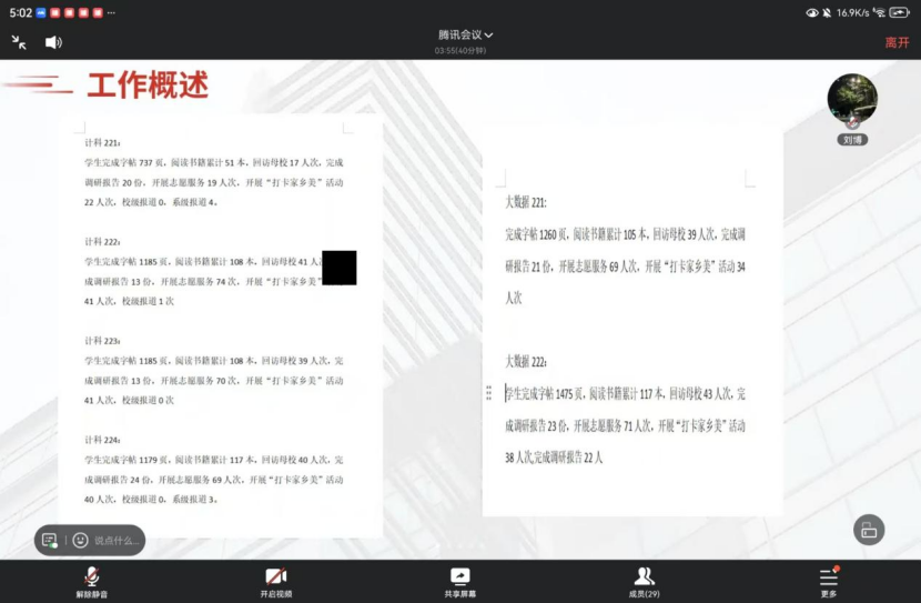 会议内容充实,涵盖多方面关键信息。在社会实践学期完成情况总结环节,通过屏幕共享展示出专业学生丰富的实践成果。同学们积极参与各项实践活动,钢楷临摹完成7021页,阅读书籍达606本,219人回访母校,完成114份调研报告,开展372次志愿活动,216人次打卡家乡美,还完成7篇系级报道。各班级在这些实践活动中成果各异,像大数据221、大数据222班级在不同实践项目上各有突出表现,展现出学生们的全面发展。