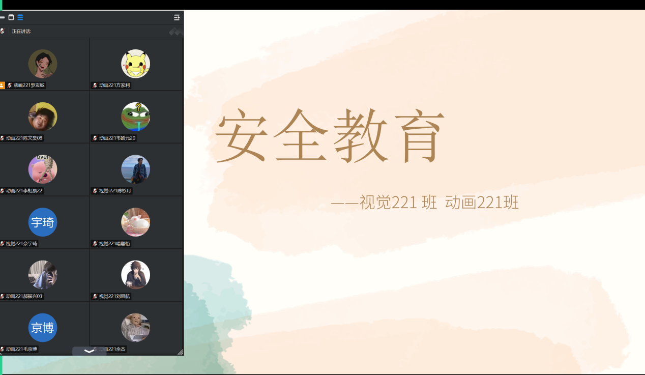 2月24日下午,视觉221班与动画221班召开安全教育线上主题班会,本次班会由薛苗苗主持,两班全体同学参与。