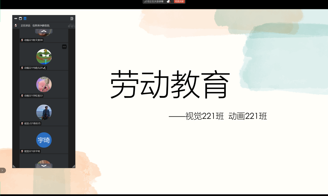 2月24日上午,动画221与视觉221班开展了“劳动教育”主题线上会议,会议由辅导员薛苗苗主持,两班全体同学参与。