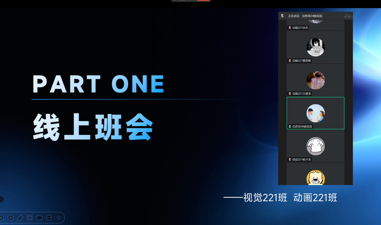 2月24日下午,视觉221班与动画221班借助腾讯会议线上平台,专业长与辅导员共同开展了一场内容丰富的主题班会,此次班会由薛苗苗老师主持,两班全体同学积极参与。