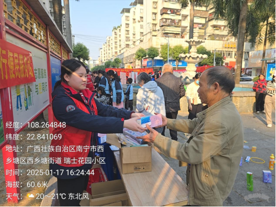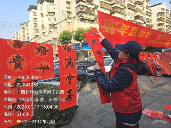 1月17日下午,SHSJ-294小组计科223胡馨芸参加了南宁市西乡塘区组织开展以“我们的节日·春节”为主题的志愿服务活动,此次活动共有12名志愿者参与,由西乡塘街道瑞士花园社区居委会主办。