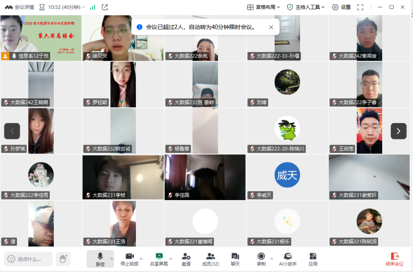 2月28日上午,生涯导师于悦通过腾讯会议召开了社会实践学期第六周总结会,会议共有32位同学参与,此次会议由于悦老师主持。