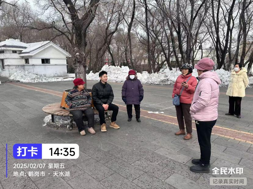 2月7日下午2点至3点,视觉专升本241班于渤同学与老人们进行了一场温馨而富有意义的关爱沟通活动。他们选择了一个阳光明媚的下午,在鹤岗市天水湖旁的长椅上,与老人们围坐一起。志愿者们耐心倾听老人们讲述过去的故事,关心他们的日常生活,用真挚的话语传递着温暖与关怀。老人们脸上洋溢着幸福的笑容,显然对这种交流感到非常满意。