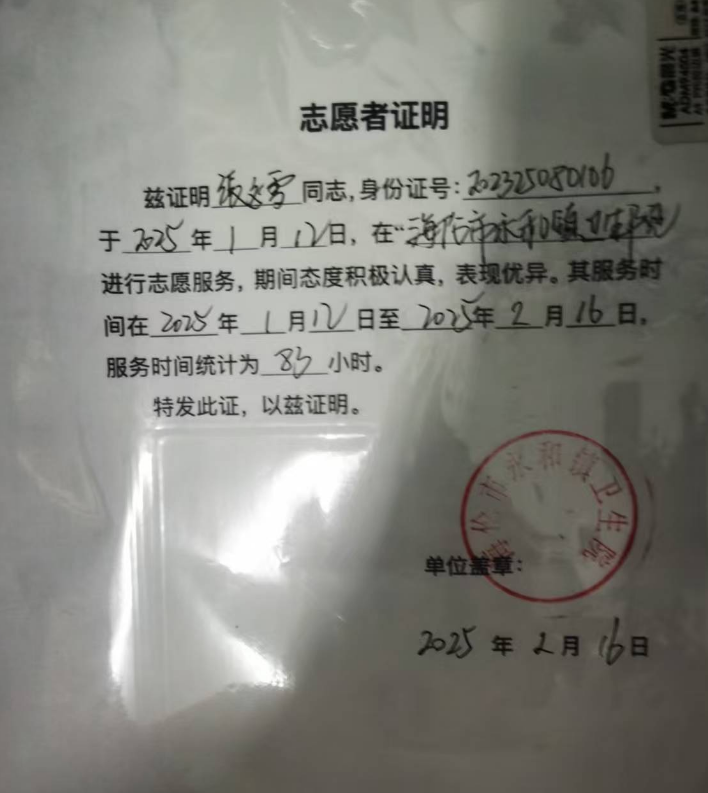 张文雪表示,能够为永和镇卫生院的病患和工作人员提供帮助,她感到非常荣幸。张文雪认为,志愿服务不仅是一种社会责任,更是一种心灵的洗礼。通过这次经历,张文雪更加深刻地体会到了医护人员的不易,也坚定了张文雪继续参与志愿服务的决心。