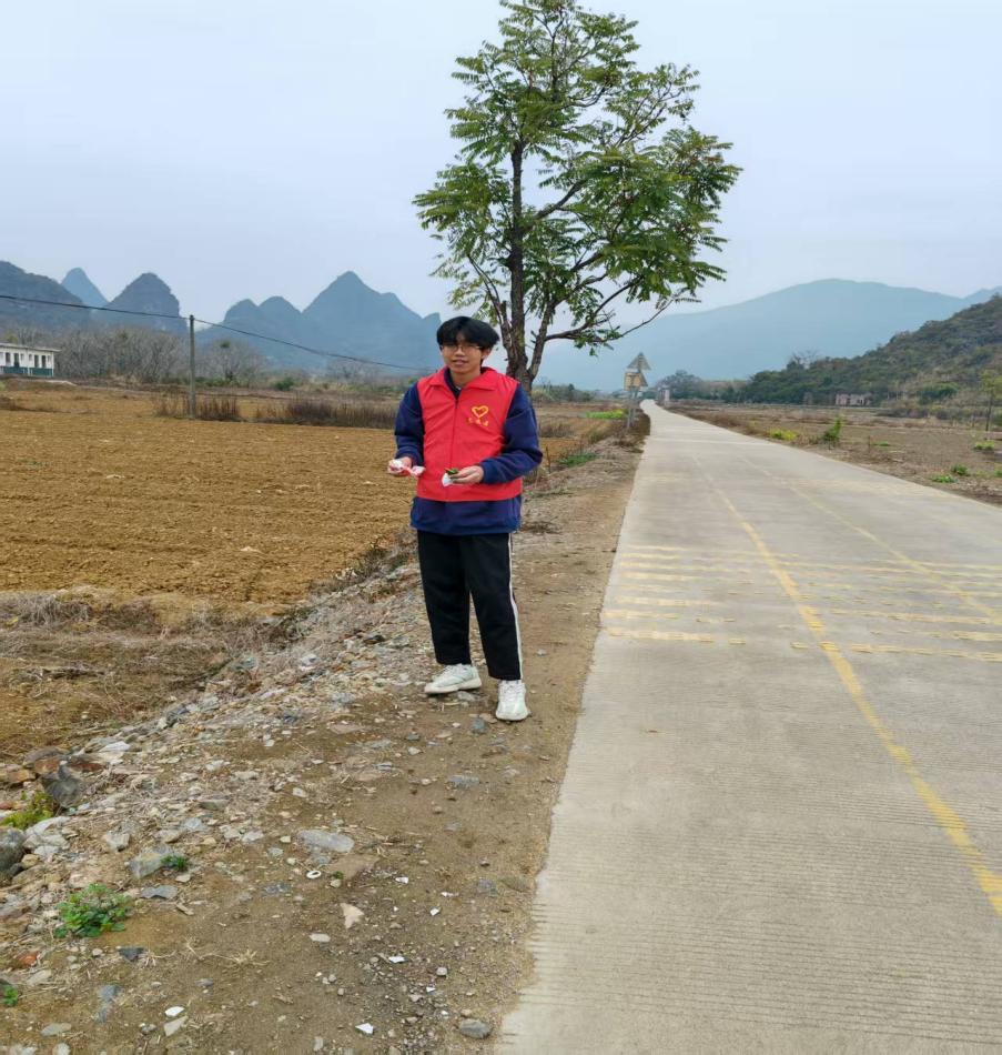 活动当天,志愿者SHSJ-403小组组员覃文雄带着扫帚、铁锹、垃圾袋等清洁工具奔赴各个区域。乡村道路两旁、河道周边、公共活动场所,到处都有他们忙碌的身影。志愿者们分工明确,有的清扫路面垃圾,有的铲除墙壁上的小广告,有的清理河道漂浮物。尽管天气寒冷,但大家热情高涨,干劲十足。
