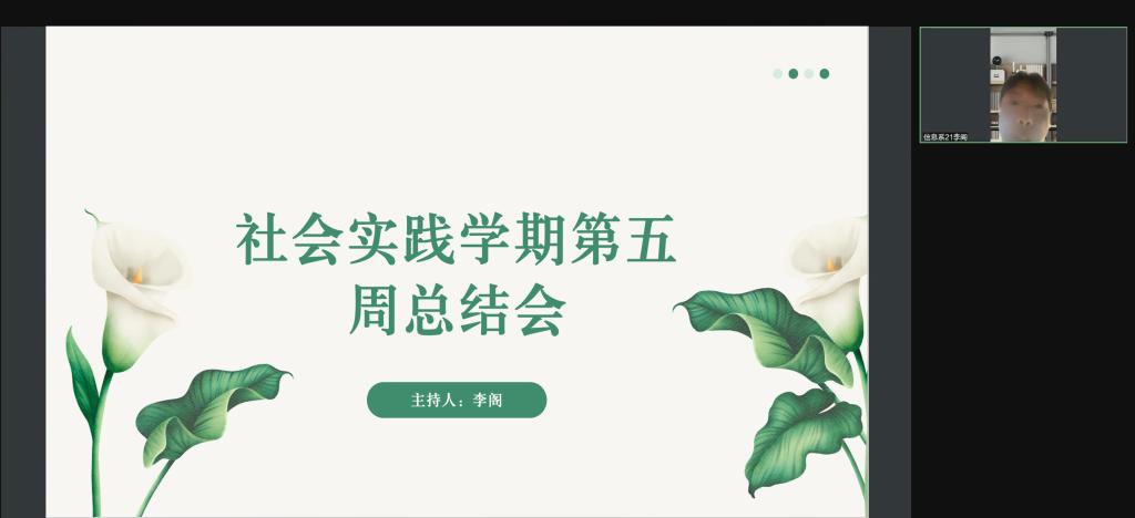 2月21日,生涯导师李阁通过腾讯会议平台主持召开了社会实践学期第五周总结会。除4人请假外,其余学生均参加了会议。