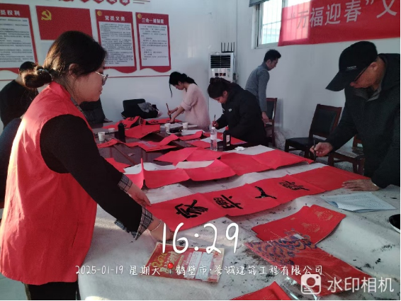 1月19日中午,SHSJ-404小组组员宋西平同学在沫水社区参加“墨舞春章喜乐汇”的主题活动。活动当天,宋西平早早到达现场,首先对场地进行精心布置。悬挂红灯笼、张贴传统剪纸等装饰,营造出浓郁的新春氛围。书法创作区摆放好桌椅、笔墨纸砚等工具,确保参与者能舒适、便捷地进行创作。然后,知名书法家们上台,为大家进行书法示范。从握笔姿势、笔画结构到书写技巧等方面进行细致讲解,并现场挥毫泼墨,创作出一幅幅精美的春联作品。宋西平同学在一旁协助书法老师,递上毛笔、摊开红纸,为书写春联的老师打下手,保证书写过程顺利进行。