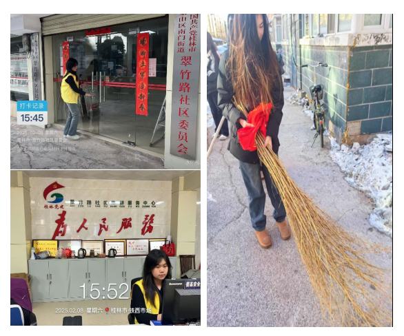 在活动中,郭洳彤选择到四季花都热卤当家担任前台收银员,第二天又在林阳公司实践,跟随室内设计师从CAD软件入手,将学校学到的知识运用到实践中去。韦培师跟随社区主任进行了拜访老人,清理社区街道垃圾的任务,改善了环境卫生状况。陈杉月在村委的带领下进行村中心街道打扫工作,不仅改善了卫生还传递积极向上的社会正能量。闫兆婧在社区工作者的带领下清理积雪,为居民减轻出行隐患。戴梦雪和社区的努力下保障了居民的安全出行。