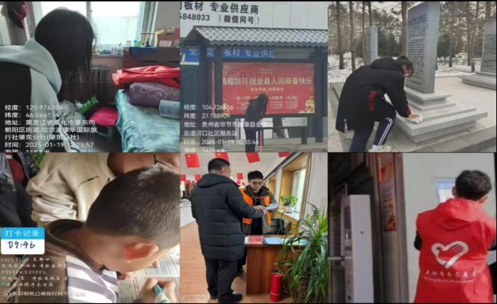 此外,大数据232班的王欣玥、路嵌羽,计科233的李明强,大数据231游锋,大数据241班的薛宇彤,计科242班的王梓吉,计科243班的夏玉杰,大数据242班的宝艺轩、大数据231游锋、大数据232李佳立,大数据242张新琳参与了社会志愿活动。薛宇彤在桦川县烈士陵园开展祭扫活动,站在庄严肃穆的陵园中,向烈士们敬献鲜花,深切缅怀革命先烈的丰功伟绩,内心充满对先烈的感恩与敬仰,更加坚定传承红色基因的决心。王梓吉在社区服务,与独居老奶奶聊天,耐心倾听老人的故事,给老人带去温暖与陪伴,从老人的经历中收获生活的感悟,也意识到关爱老人是社会的责任。夏玉杰在车站帮助乘客返乡,在忙碌中体会到帮助他人带来的快乐,看到乘客们顺利踏上归乡之路,心中满是成就感,也感受到自己的付出让这个寒冷的冬日多了一份温暖 。宝艺轩在林西镇寄宿制小学给小学生讲故事,看到孩子们纯真的笑脸和专注的眼神,感受到教育的意义和价值,每一次讲述都是知识的传递,希望能在孩子们心中种下美好的种子。王欣玥在肇东康泰老年公寓当志愿者,陪老人下棋、唠嗑,还帮着收拾房间,看到老人的笑容,她心里暖乎乎的,明白了关爱老人的意义。路嵌羽在银山街道社区协助宣传垃圾分类,给居民发手册、解疑惑,结束后看着整洁的社区,成就感满满,觉得自己的付出很值。