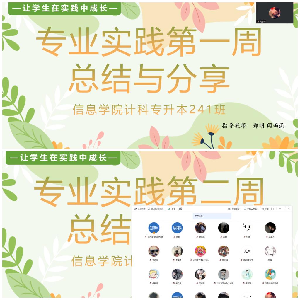 2025年6月27日下午16时,计算机科学与技术专业(专升本)241班专业实践学期第二周线上总结会如期召开。本次会议旨在总结“校内实习”与“自主实习”两大实践方向学生近期的学习成果与经验,闫雨函、郑明两位指导老师及全体实践学生参会。同学们踊跃发言,分享了实践进展、技术心得与挑战应对经验,展现了良好的学习状态和实践热情。