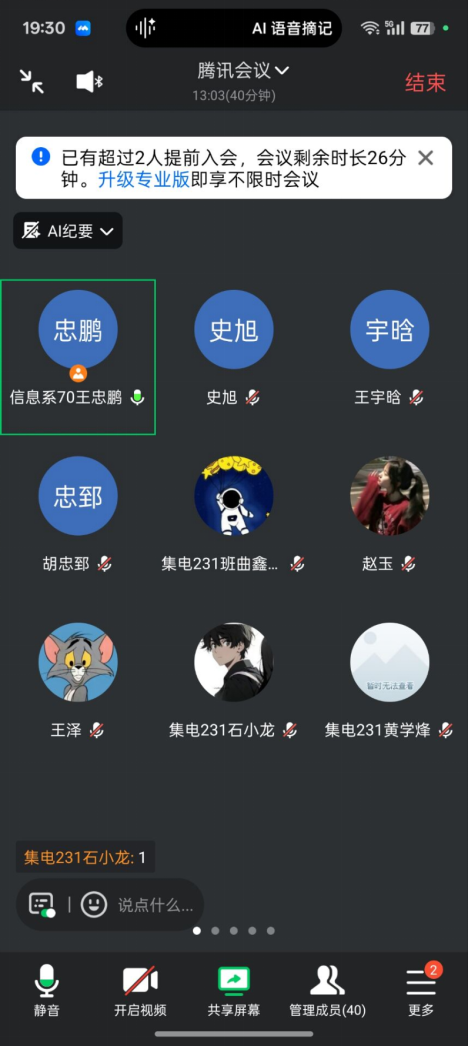 7月5日晚上,集电231班在腾讯会议上召开专业实践会议,本次会议由集成电路设计与集成系统专业教师王忠鹏主持,共有40余人参与本次会议。