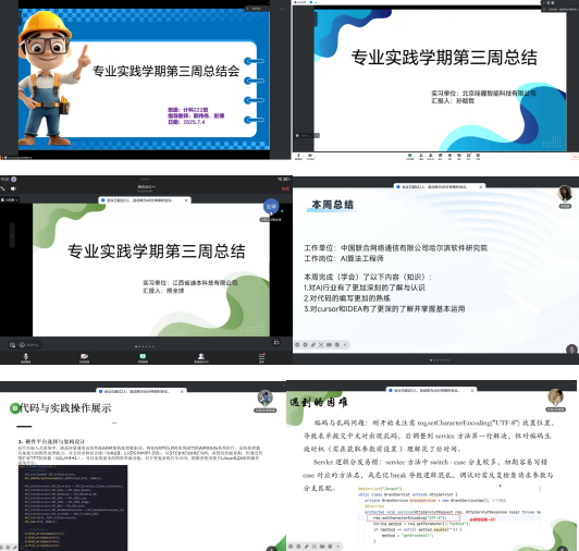 在第三周总结会上孙晗哲、何海源、李承泽、熊全球、柴锐同学积极分享了自己的实习成果及下周计划,介绍了自己的学习内容以及在实习过程中遇到的问题及不足,指导教师为其提供解决思路以及提升方案。同学们认真努力,充分利用实践机会来扩充知识、提升自我。