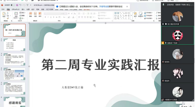 6月17日起,大数据专业241班36名同学正式进入专业实践学期的学习。校内指导老师朱琳分别于6月22日、28日19时至20时,召开周总结会议。大数据241班全体同学在线参加。总结会中朱琳老师及时梳理实践进展、明确要求、筑牢安全防线,推动同学们在实践中稳步提升。