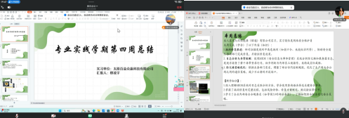 第四周总结会上,任帅、岳文浩、李珊珊、曾一鸣、柳玉甫、陈雨彤、穆凌宇等同学踊跃分享实习成果与下周计划,详细介绍了阶段性学习内容,并坦诚剖析了实习中遇到的问题与自身不足。针对这些情况,指导教师逐一提供了切实可行的解决思路与针对性提升方案,助力同学们更好地推进后续实习工作。全体同学始终保持认真努力的态度,充分把握实践机会,致力于扩充专业知识、提升综合素养。