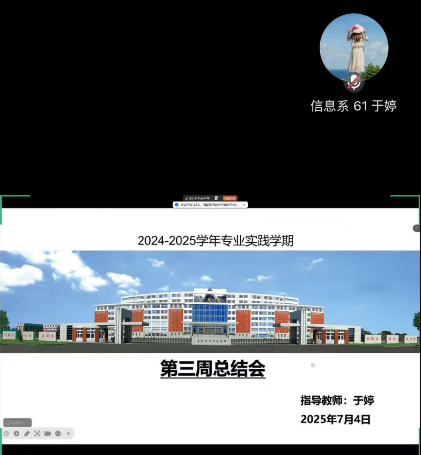 7月4日晚,数据科学与大数据技术专业的于婷老师,召开了第三周学习工作总结会议,重点围绕同学们校外实习的情况展开交流与总结,于婷老师也借此机会和同学们分享了一些重要的要求和期望。