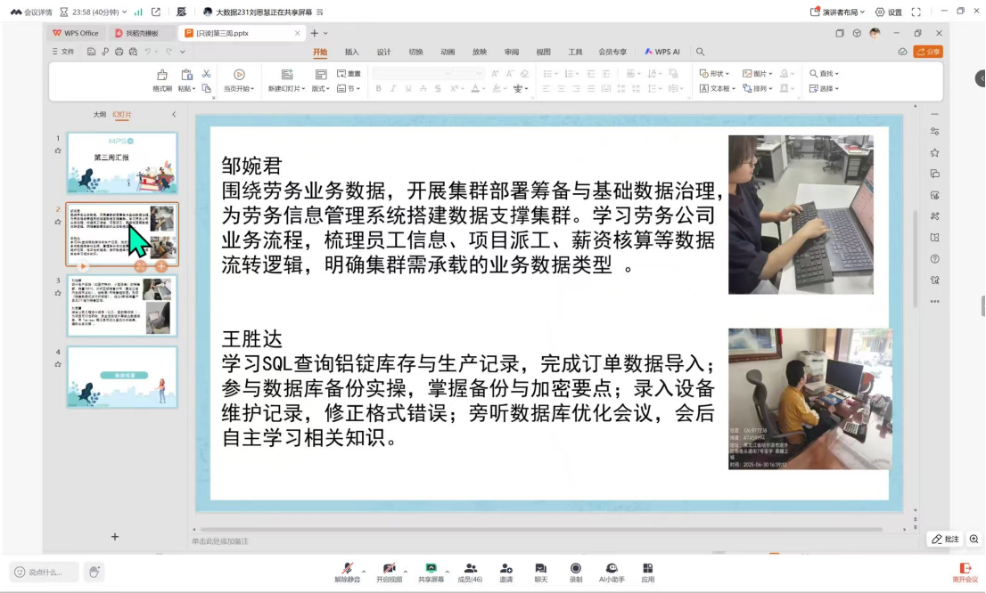 随后,同学们依次分享了本周在实习单位的工作内容和收获。从大家的反馈中,老师也看到很多同学已经逐渐适应了实习单位的工作节奏,能够独立完成一些基础的数据处理和分析任务。有的同学参与到实际项目的数据清洗工作中,通过实践对数据的规范性和准确性有了更深刻的认识;还有同学在导师的指导下,尝试运用所学的大数据分析工具进行数据建模,虽然过程中遇到了不少困难,但都在积极寻求解决办法,这种迎难而上的精神让老师倍感欣慰。