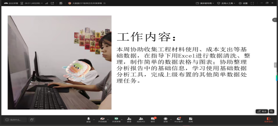 多组同学精心制作PPT,以图文并茂的形式进行周总结汇报。他们从任务完成情况、遇到的问题及解决方法、个人收获与反思等维度展开,清晰呈现一周以来的学习与工作进展,生动的展示形式让汇报内容更直观、更具感染力,也展现出同学们良好的总结归纳与表达能力。