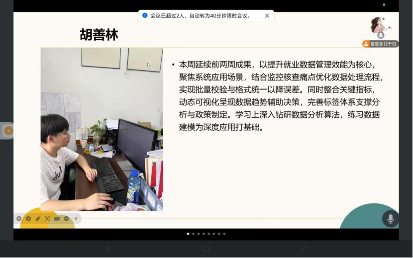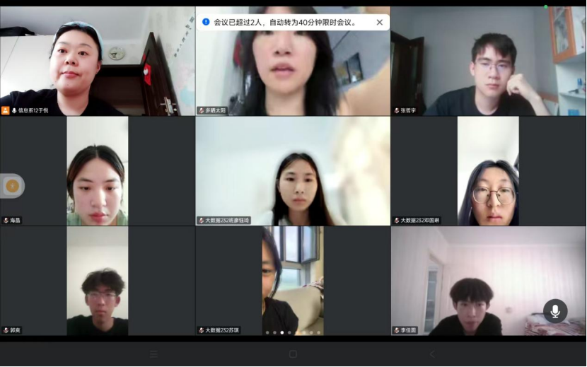 7月25日,大数据232班开展专业实践学期第六周线上总结会,指导教师于悦主持会议,全班51名同学参会。