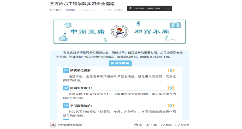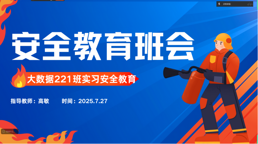 7月27日,为切实保障学生在专业实践学期的安全,帮助学生全方位掌握安全知识与技能,大数据221班专业实践指导教师高敏线上围绕《齐齐哈尔工程学院实习安全指南》内容,引导学生将安全意识深植于心、外化于行。