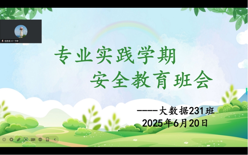 为切实保障同学们专业实践期间的人身安全与工作顺利推进,2025年6月20日,大数据231班精心组织专业实践学期安全教育班会,于婷老师全程主持,全班同学参加,聚焦实习场景安全要点,为即将开启或正在进行实践的同学们筑牢安全屏障。
