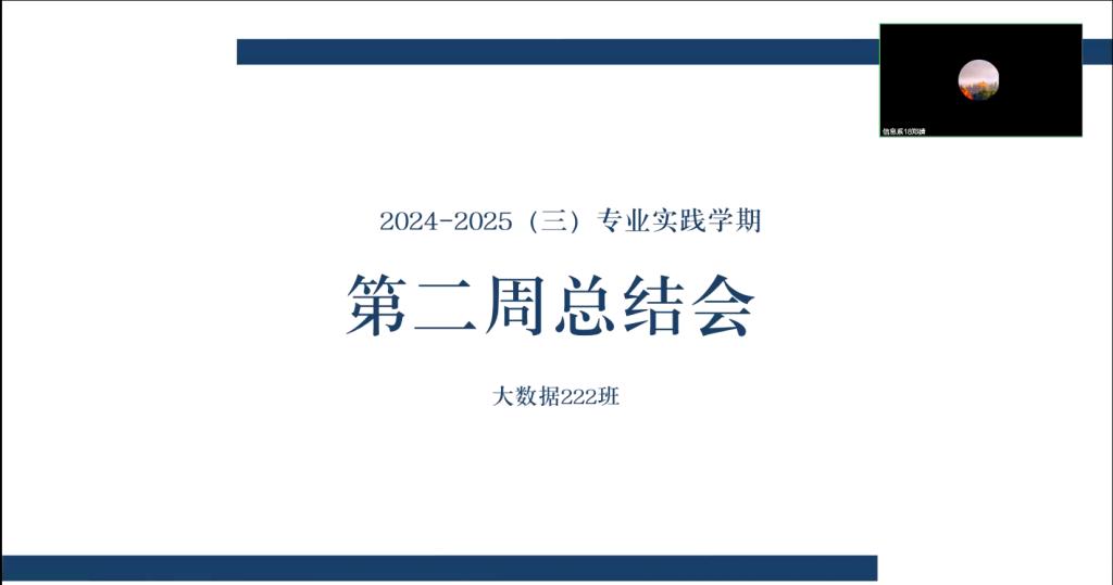 6月30日晚,大数据222班专业实践学期第二周线上总结会顺利召开,本次的线上会议由指导老师郑婧主持,大数据222班全体同学参会。