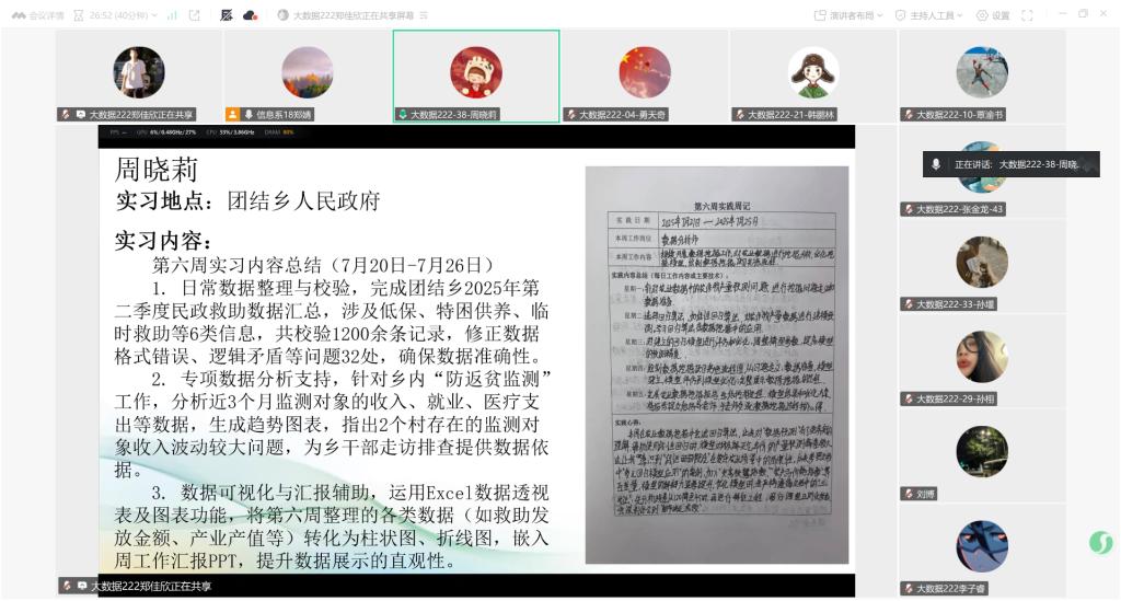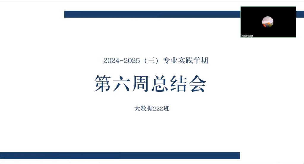7月27日,大数据222班线上召开第6周总结会,由指导教师郑婧主持,旨在强化实习纪律、推动工作落实与梳理实践收获。