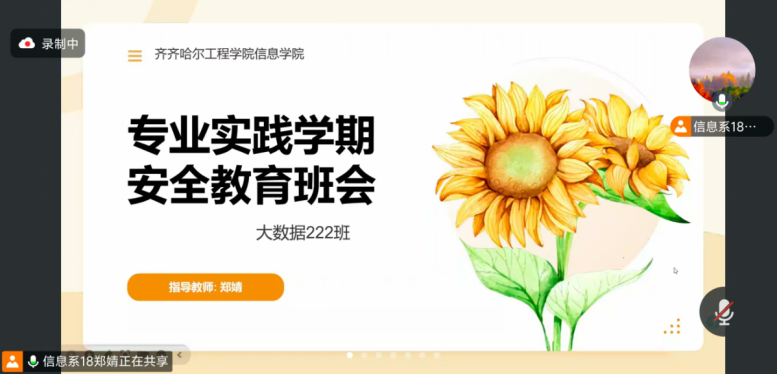 7月28日,为保障学生在专业实践学期的人身与财产安全,让学生扎实掌握安全相关知识与应对技能,大数据222班专业实践指导教师郑婧围绕《齐齐哈尔工程学院实习安全指南》内容,在线上召开了安全教育主题班会。