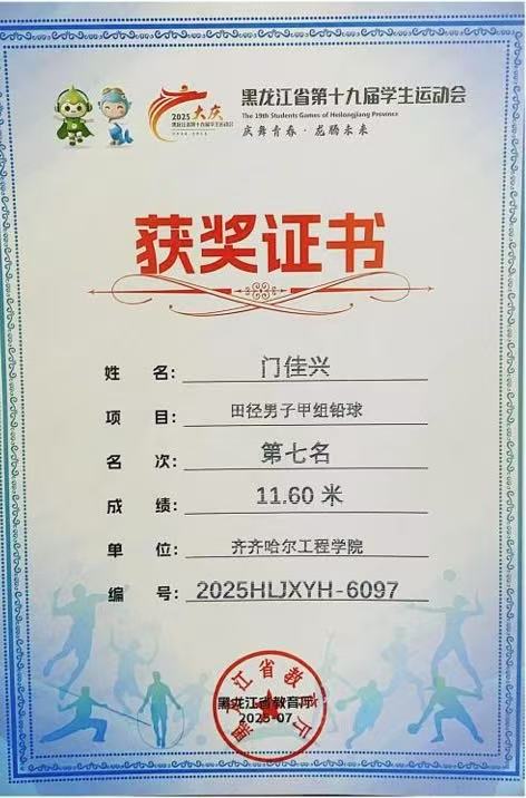 与此同时,门佳兴同学在黑龙江省第十九届学生运动会上表现优异,荣获田径男子甲组铅球比赛第七名,成绩为11.60米。这一成绩不仅展现了他在体育领域的专业能力,也为学校争得了荣誉。