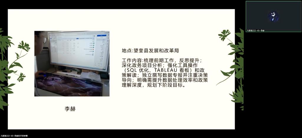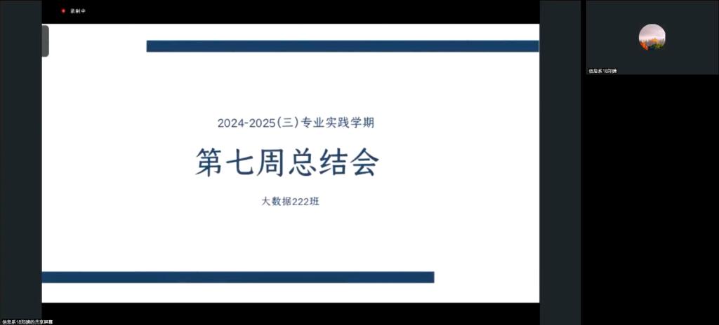 8月4日晚,大数据222班在腾讯会议召开专业实践学期第七周总结会,会议由指导教师郑婧主持,大数据222班学生参与。
