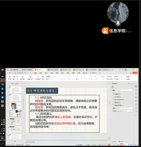 随后,会议进入学年论文撰写指导环节。杨学仁老师结合计科专业的特点和学年论文的要求,从论文选题、文献查阅、框架搭建、内容撰写到格式规范等方面进行了详细讲解。在内容撰写上,要求同学们要观点明确、论据充分,语言表达要准确、简洁、规范。此外,杨老师还着重强调了论文的格式规范,提醒同学们要严格按照学校和学院的要求进行排版,注意字体、字号、行距、参考文献格式等细节问题,确保论文的格式符合要求。