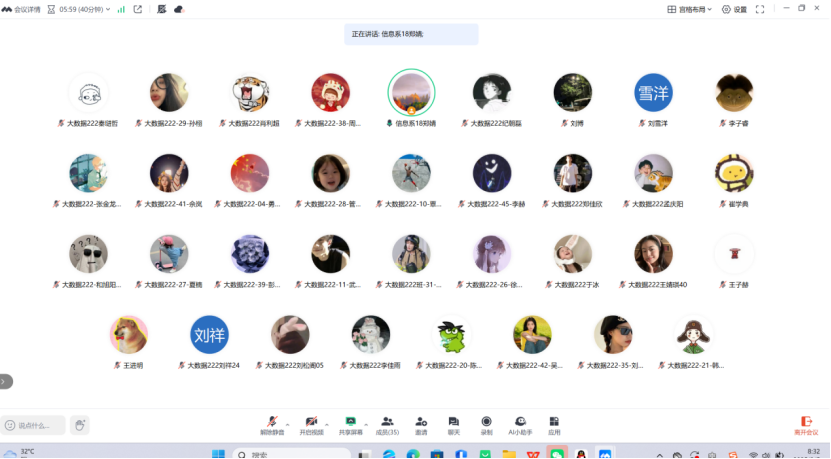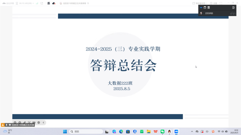8月5日,数据科学与大数据技术专业大数据222班开展专业实践学期答辩,全班同学以小组为单位通过腾讯会议开展线上答辩,本次答辩由该专业指导老师郑婧老师主持。首先,郑婧老师详细说明本次专业实践学期答辩的流程规范,强调答辩是对专业实践成果的重要检验,与专业知识的深化和实践能力的提升紧密相关,并要求全体同学以严肃认真的态度投入到本次答辩中。