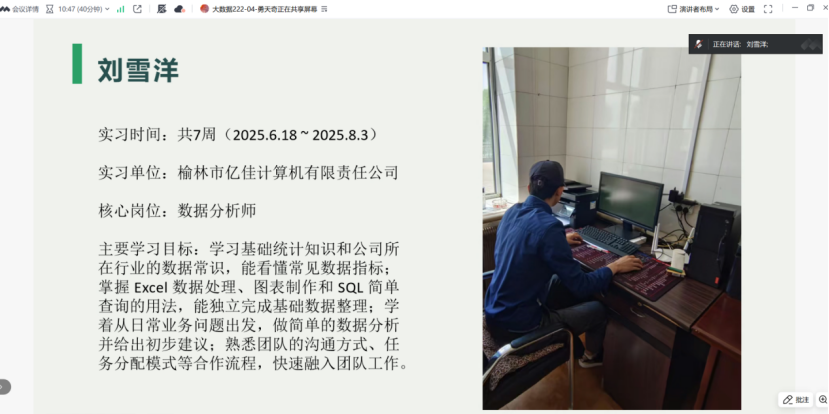 随后,各小组依次进行汇报。他们围绕实践单位的基本情况、具体实践内容展开介绍,结合数据科学与大数据技术专业特色,详细阐述了在实践中参与的大数据采集、清洗、建模分析以及大数据平台搭建与维护等工作,还通过PPT展示了包括数据分析报告、优化后的算法模型、搭建的小型数据处理系统等实践成果,分享了实践心得。汇报中同学们表达清晰、逻辑严谨,充分展现了收获与成长。每个小组汇报结束后,郑婧老师结合实践内容进行细致点评与针对性提问,既关注数据建模合理性、算法选择依据等技术细节,也重视团队协作、难题应对等综合表现,同学们沉着应对,展现了扎实专业功底和良好综合素养。