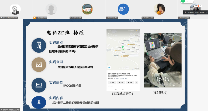 会议期间,首先,关娜院长围绕专业实践学期任务进行详细部署。她强调,实践学期是电子科学与技术专业人才培养的关键环节,需重点完成五项任务,包括书写实践手册、完成学习通作业、撰写实践论文、焊接电子元件以及梳理每周心得体会。接下来,开始答辩环节,学生按小组依次汇报实习成果。以杨烁同学为例,她在贵州聚四方电子科技有限公司担任IPQC检验员,她分享了实际产线的经验,以及其他方面的技能提升。其他同学也围绕各自实习企业,从技术应用、项目参与、团队协作等维度展开汇报,展现了将所学课程理论转化为实践能力的过程,也反思了实习中遇到的挑战与解决策略。最后,关娜老师做出总结,本次专业实践学期答辩汇报,是学校深化产教融合、强化实践育人的生动体现。通过专业实践学期与线上答辩结合的形式,既检验了学生在真实职场环境中的专业应用能力,也通过院长的任务部署,帮助学生提前适应产业一线技术要求,为成为“懂理论、善实操、能创新”的电子技术人才奠定基础。