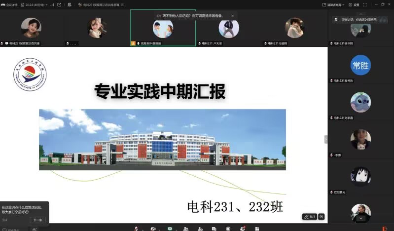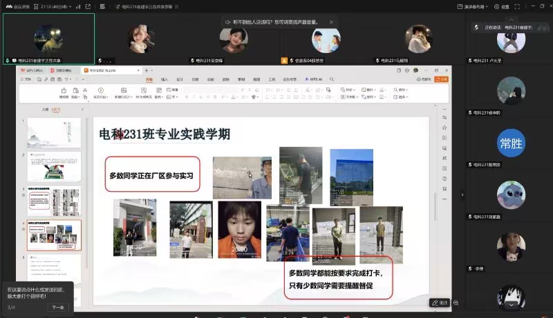 7月25日下午,电科23级利用腾讯会议展开“实践学期中期总结”主题班会。此次班会由辅导员薛苗苗主持,电科23级共有60人参加。