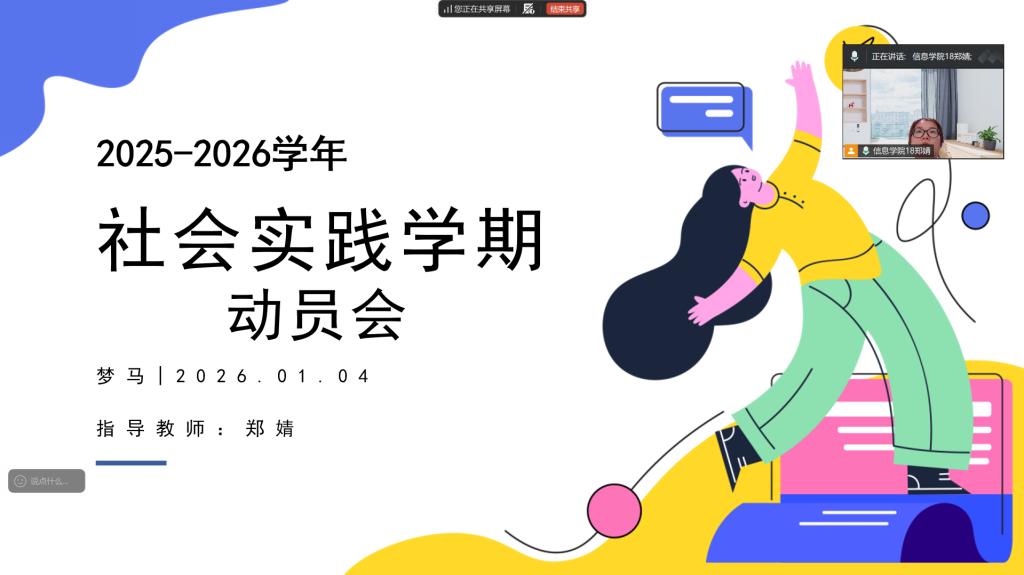 1月4日上午,郑婧老师通过腾讯会议组织召开了社会实践学期动员会,本次会议由郑婧老师主持,共14人参加。