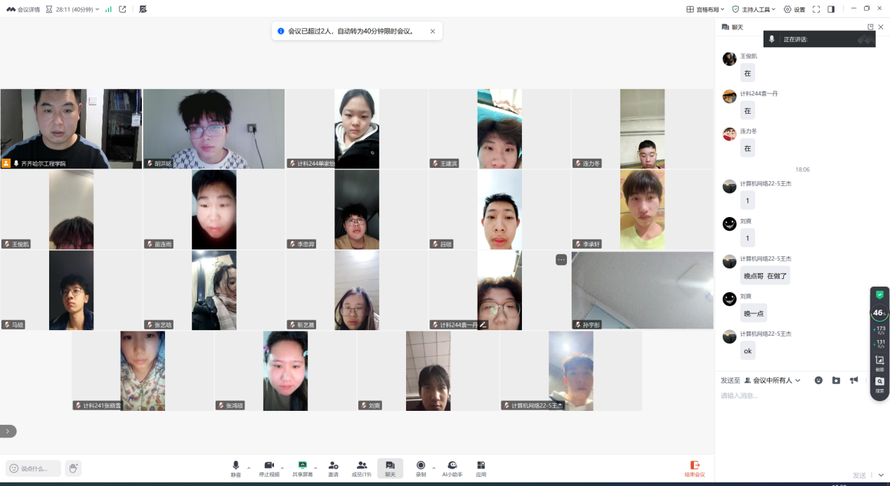 在互动答疑与专项指导环节,王坤宇老师让学生提出实践中的困惑,针对任务衔接、流程细节等疑问逐一细致解答;同时,专项讲解了实践报道撰写的格式规范、内容侧重点等要求,助力学生提升实践成果呈现能力。为规划实践进程,要求全体成员制定社会实践学期项目内容计划表,明确各阶段目标与推进举措,确保实践工作有序高效开展。