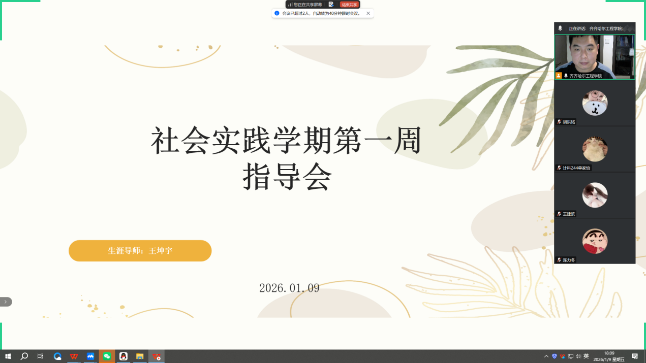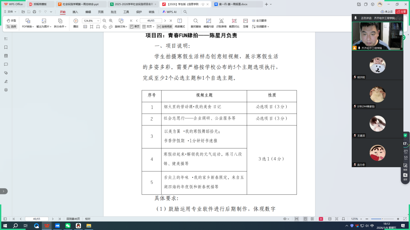 1月9号王坤宇老师召开了社会实践学期第一周指导会议,会议伊始,王坤宇老师首先组织各实践小组组长汇报第一周工作开展情况及整体进度,重点督促"五育并举"德育模块的学习落实,引导学生将德育要求融入实践全过程。随后,围绕"青春FUN肆拍""寻新'荐'面礼"两项核心实践任务,老师详细解读了实施流程与关键注意事项,明确了筹备阶段的核心时间节点与小组分工要求,帮助学生理清工作思路、找准推进方向。