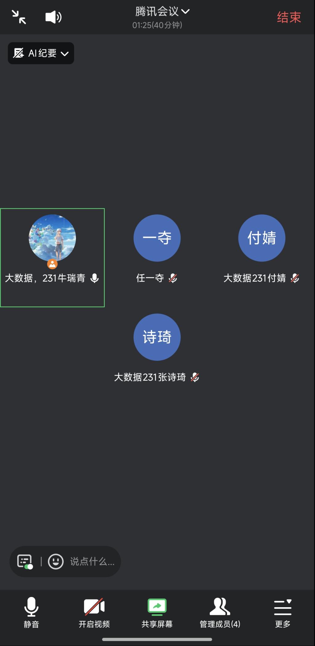 01 月 07 日晚上,牛瑞青小组在腾讯会议平台召开第一周实践心得分享会议,由组长牛瑞青主持,小组成员任一夺、付婧、张诗琪共 4 人参加。