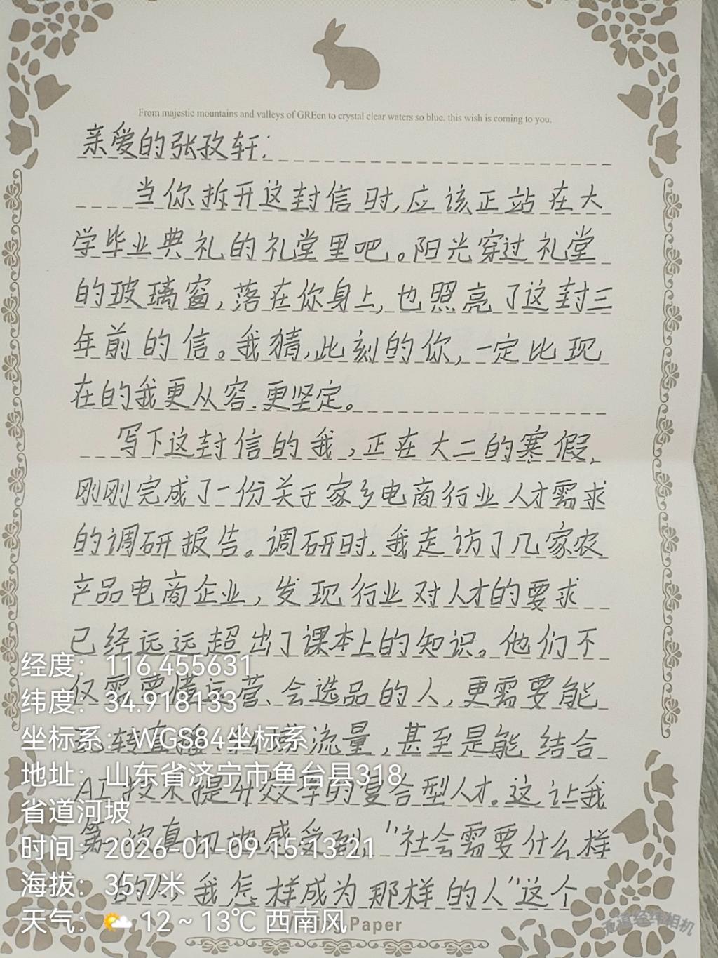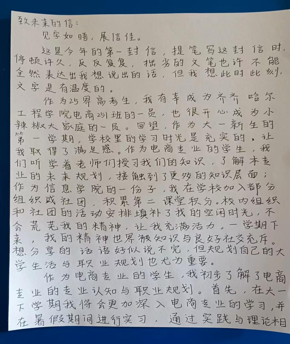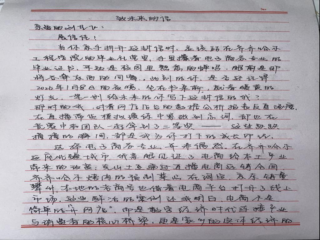 电商251班刘艺飞将信写成家乡电商发展蓝图,细数齐齐哈尔烤肉、龙江杂粮等本土好物的优势。他规划在校期间夯实转品、场控实操能力,毕业后进入东北本土电商企业,从拍摄带货视频起步,搭建特色产品电商出海链路,让更多人看见东北好物的价值。