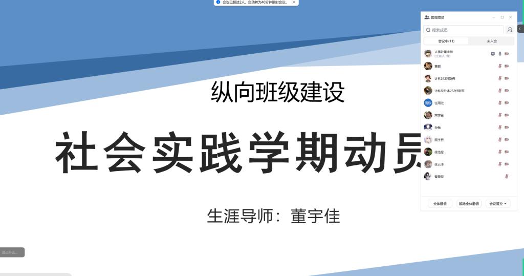 为明晰实践方向、凝聚奋进力量,1月4日,生涯导师董宇佳依托腾讯视频会议平台,组织召开社会实践学期动员会,为同学们投身实践保驾护航。