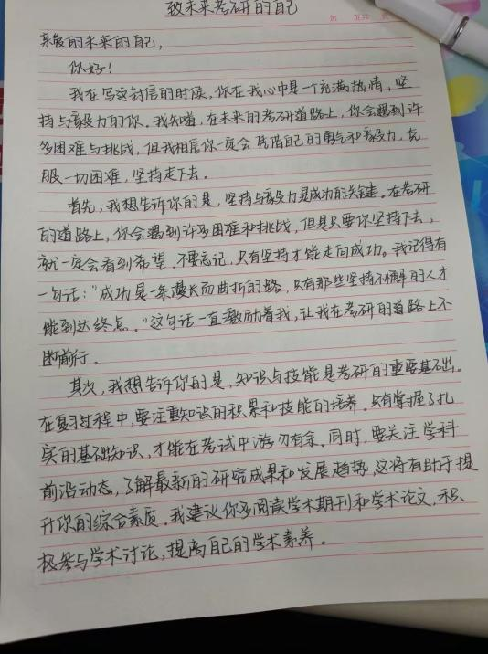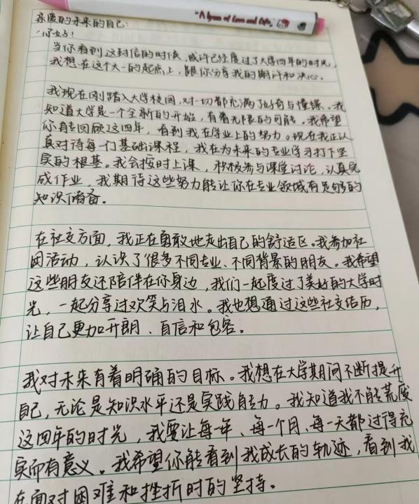 翟智炫的笔触则多了几分对社会实践的思考,他在信中规划着未来参与电商助农项目的蓝图,希望能运用所学知识,为家乡齐齐哈尔的特色农产品打通线上销路,让 “龙江好物” 走出黑土地。郭涵宇则从个人成长角度出发,写下了对未来考研、考证的具体规划,字里行间满是脚踏实地的笃定。一笔一画间,不仅是对未来的憧憬,更是对当下的鞭策。