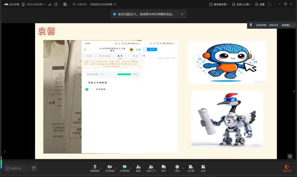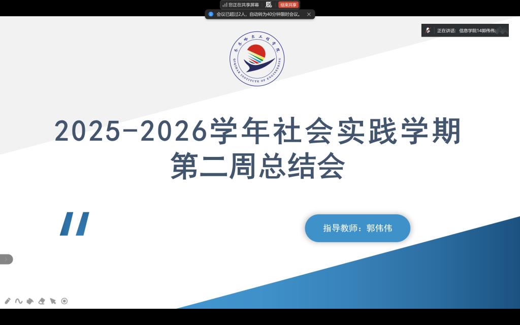 2026年1月16日晚,指导教师郭伟伟召开社会实践学期第二周指导会议,会议通过腾讯会议线上召开。目前,社会实践学期已顺利推进至第二周,为进一步校准实践方向、强化团队协作效能,指导教师郭伟伟针对各小组本周实践成果开展复盘指导,并部署下周重点任务,SHSHJ-034实践小组全员参与会议。
