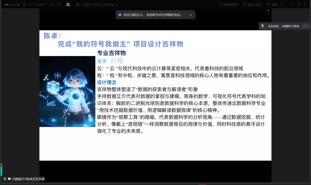 第二组李诗琦组(大数据231李诗琦、大数据231宋佳蓉、大数据232胡磊、大数据232刘世豪),本周扎实推进实践筹备工作,核心完成“我的符号我做主”主题相关任务,利用AI技术制作实践吉祥物,同时积极开展志愿服务的各项准备工作,为后续志愿服务顺利开展筑牢基础。