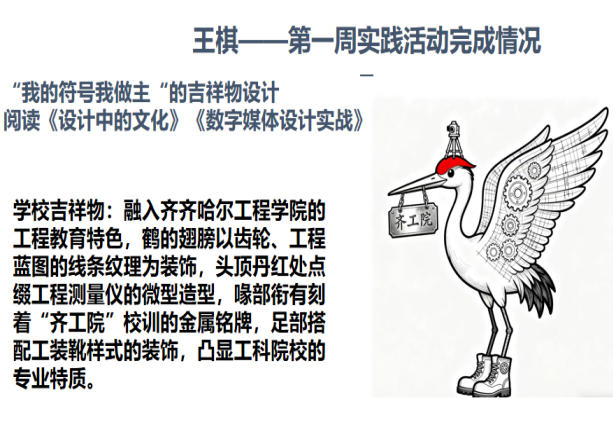 首先,张欣然同学以 “鹤城” 地域文化为灵感,设计了融合丹顶鹤造型与大数据芯片元素的吉祥物,巧妙将机械仿生结构与流动数据流结合,体现了专业特色。王棋同学则从学校工程教育理念出发,设计了融入齿轮、蓝图及 “齐工院” 校训铭牌的吉祥物形象,并完成了 “数据魔方” 核心符号设计,展现了工科院校的专业特质。