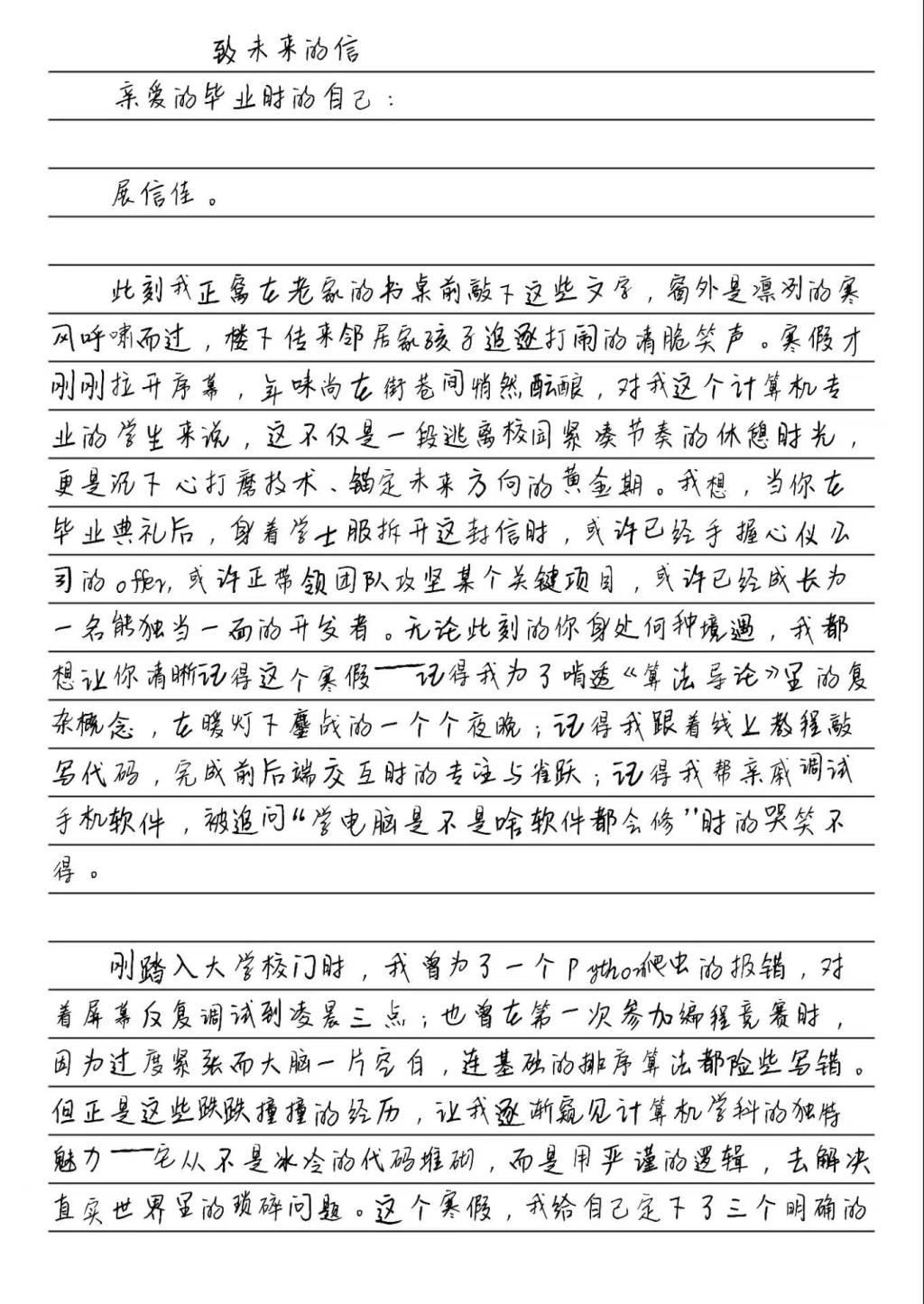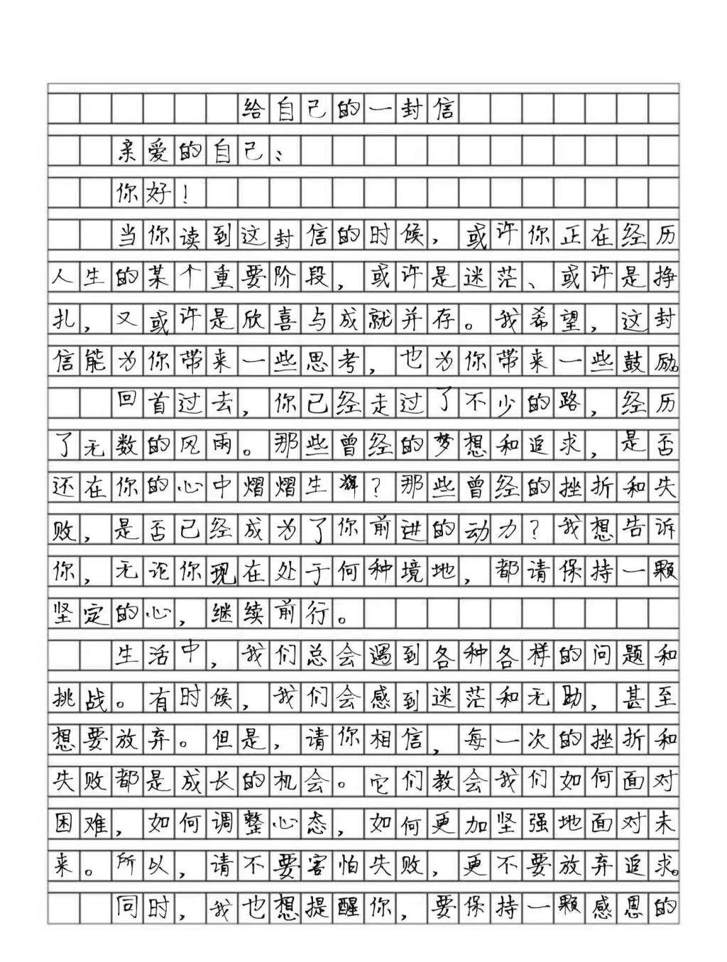 其次通过给未来的自己写信,学会了直面内心的情感,清晰地表达出对未来的憧憬、担忧与期许,让内心的想法有了具象的表达,提升了情感梳理和文字表达的能力;写作过程中,对当下的成长状态进行了全面的回顾,明确了自身的优点与不足,更加清晰地知道自己想要什么,该如何努力,树立了更明确的成长目标。