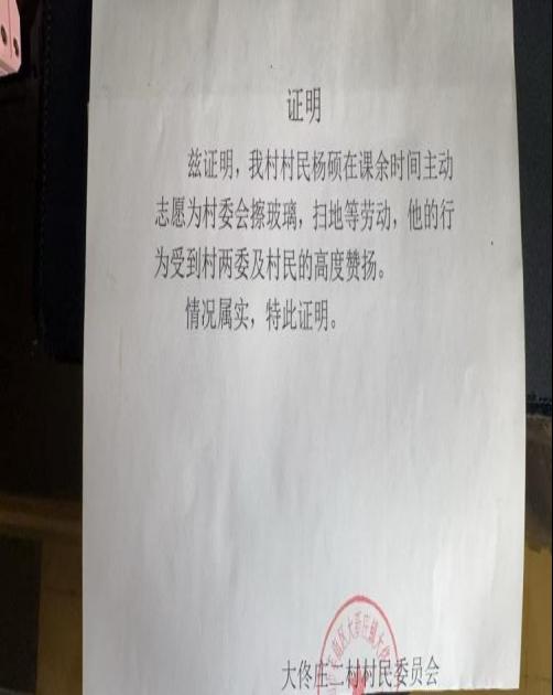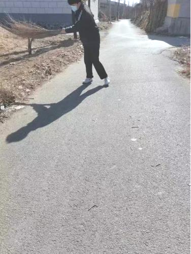 劳动中,杨硕同学不怕脏累,认真做好每一处清洁。村两委工作人员与前来办事的村民纷纷未志愿者们点赞。