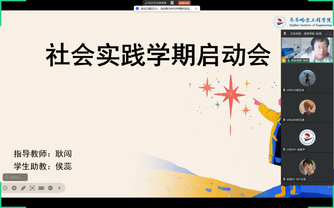 01月07日上午,指导教师耿闯通过腾讯会议平台主持召开社会实践学期动员会,助教侯蕊及7名实践学生全部准时参会。会议核心围绕社会实践学期的目标意义、任务安排、经验分享、问题答疑及安全纪律等内容展开,旨在统一思想、明确要求,为后续实践活动平稳有序开展奠定坚实基础。