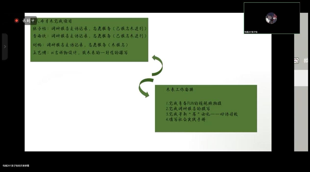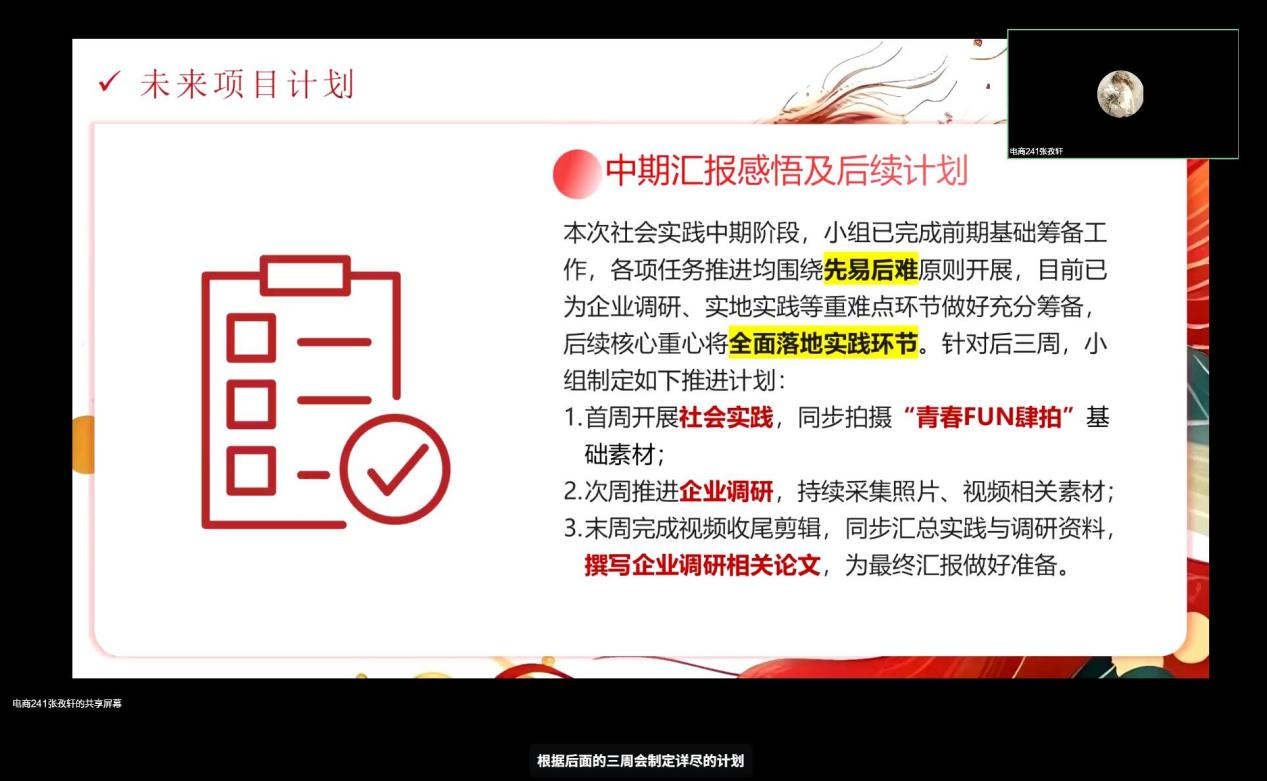 最后,毛一姝就社会实践学期青春FUN肆拍项目的推进进行安排,预计将在第五周进行交流指导会议。