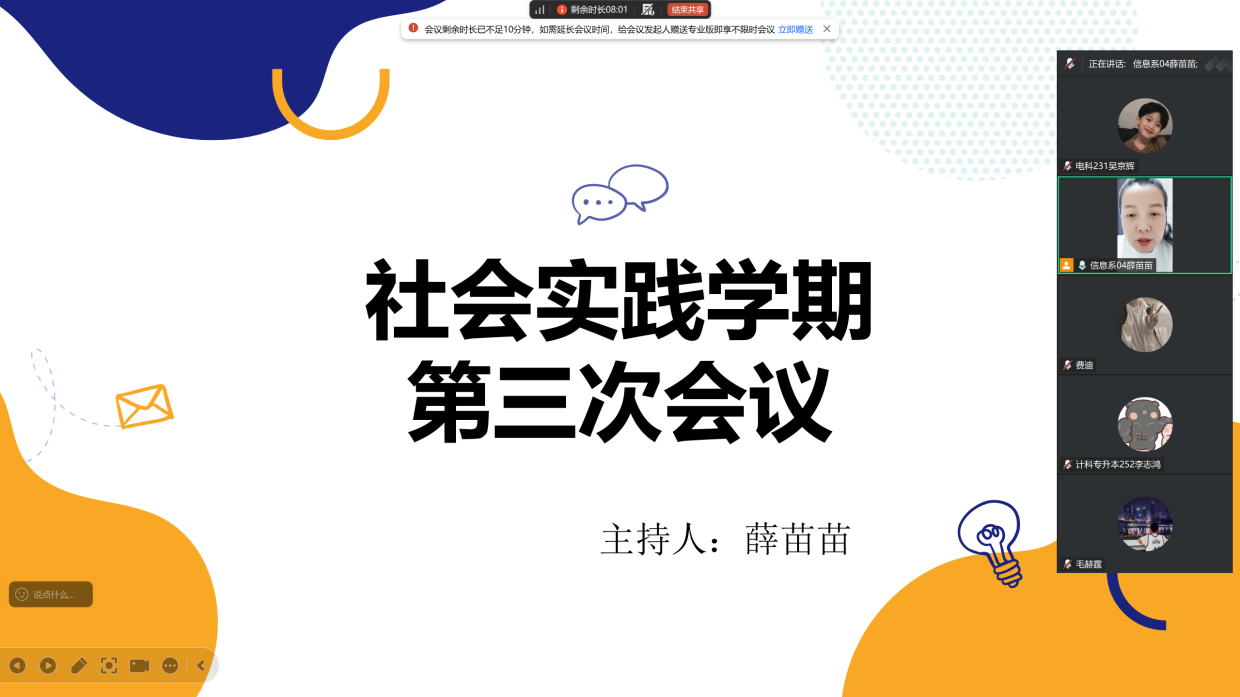 为持续推进社会实践学期各项工作提质增效,巩固前期实践成果,解决当前阶段的核心问题,1月22日下午,辅导员薛苗苗召开社会实践学期第三次会议,本次会议涵盖六个班级共百余人次参加。